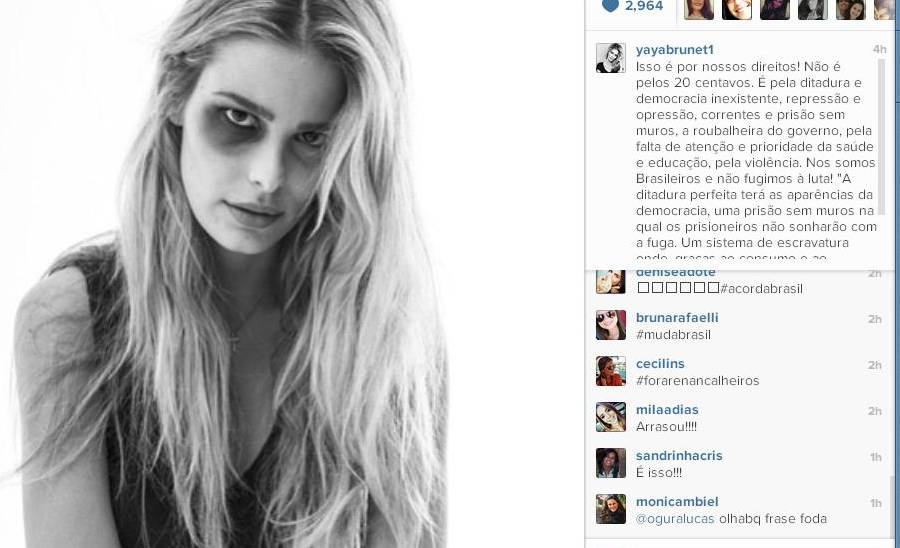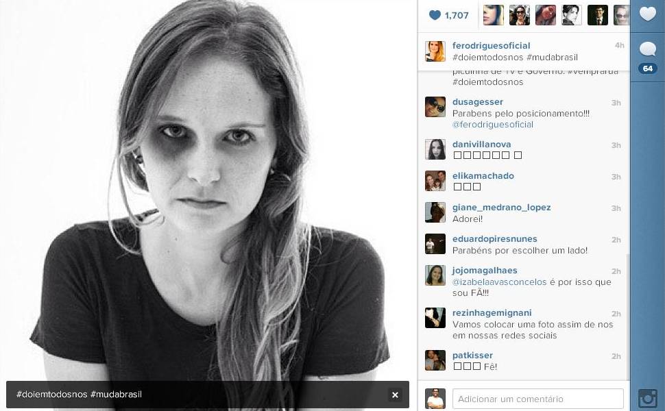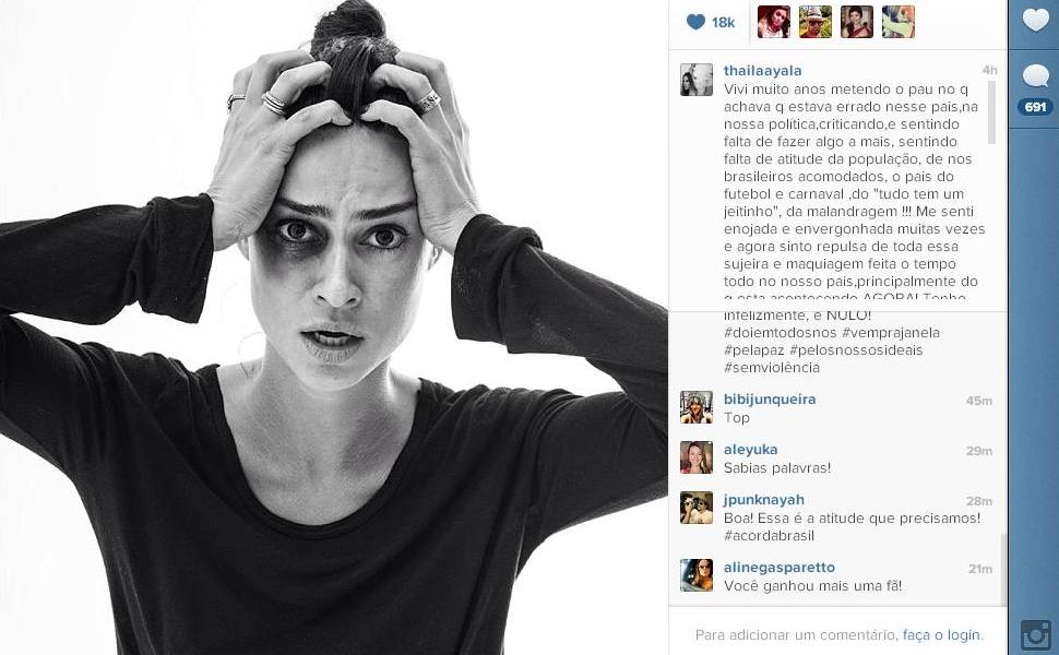 "Acorda Brasil essa é nossa chance de mudar", publicou a atriz Thaila Ayalla na rede. Paulo Vilhena, marido Thaila, também se juntou à causa e em seu perfil o ator disse que a foto faz parte de mais uma manifestação entre tantas que vem acontecendo em todo o país.