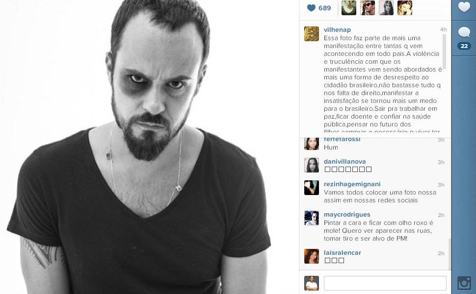 "A violência e truculência com que os manifestantes vêm sendo abordados são mais uma forma de desrespeito ao cidadão brasileiro", publicou na legenda da foto Vilhena.